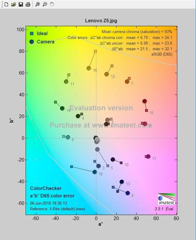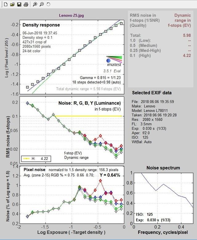 可以看到,联想Z5解析力表现在2000线左右,色彩还原表现和白平衡则中规中矩,不过其动态范围值高达5.98,接近满分,可见控噪能力不俗。