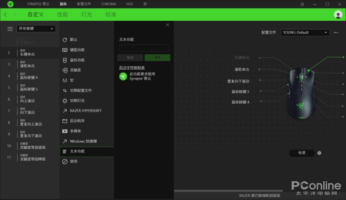 设置版面非常干净整洁,除非调出设置选项,版面的洁净程度值得赞赏,会直接出现鼠标的立体图示,可以在页面中对按键直接进行调试设置自定义。