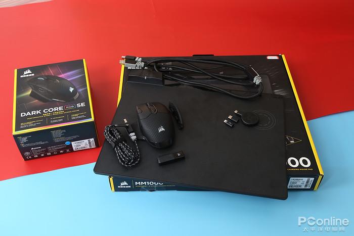 海盗船的Dark SE暗影+MM1000QI的配件组合就更复杂了,鼠标盒内除了分离式的线材、无线2.4GHz接收器之外,还附赠了一个小拇指位的可更换式侧裙。