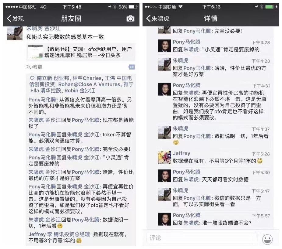 除去补贴大战,摩拜和ofo背后的资本力量,也时不时在公开场合进行一番较量,其中最经典的就是腾讯CEO马化腾和金沙江创投朱啸虎在朋友圈的那次“嘴炮”。