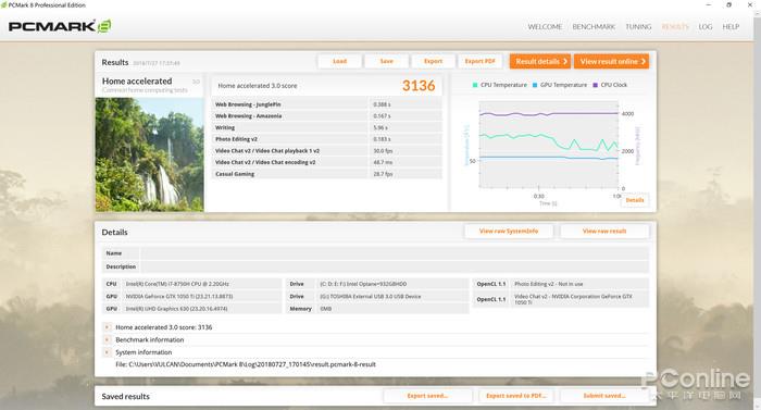 我们用PCMark 8对火影金钢T5的综合性能进行了测试,这款软件测试项目包括计算、存储、游戏、图形处理等诸多我们使用过程中常用的一些功能,参考价值也比较大,火影金钢T5的得分为3136分。