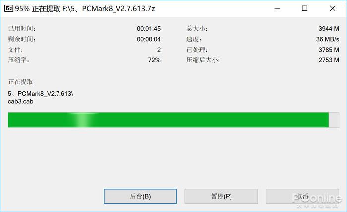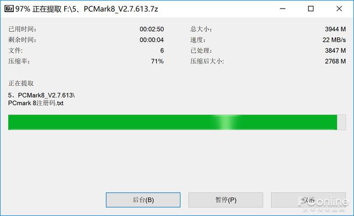 我们将一个大小为4GB的文件进行解压,在启用傲腾时所耗费的时间为1分50秒左右,在禁用傲腾时所用的时间为2分50秒左右,前后的差距大概为一分钟,启用傲腾时速度提升了54%。