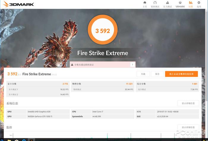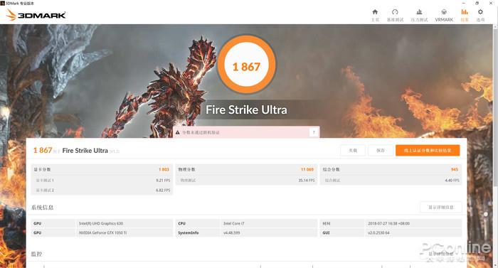 火影金钢T5拥有着出色图形处理能力,我们在3DMark中用了多个模式分别进行了测试,其中Fire Strike模式得分为6804分,Fire Strike Extreme模式得分为3592分,Fire Strike Ultra模式得分为1867分。