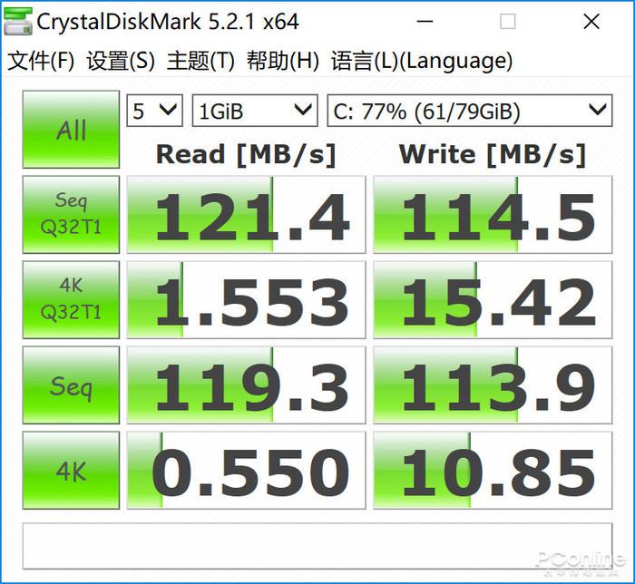 在禁用傲腾内存之后,火影金钢T5机械硬盘的持续读取速度为119MB/s,持续写入速度为113MB/s,4K随机读取速度为0.5MB/s,4K随机写入速度为10.8MB/s,硬盘的读写速度非常之慢,从数据上来看,傲腾内存对机械硬盘的加速效果是比较明显的。