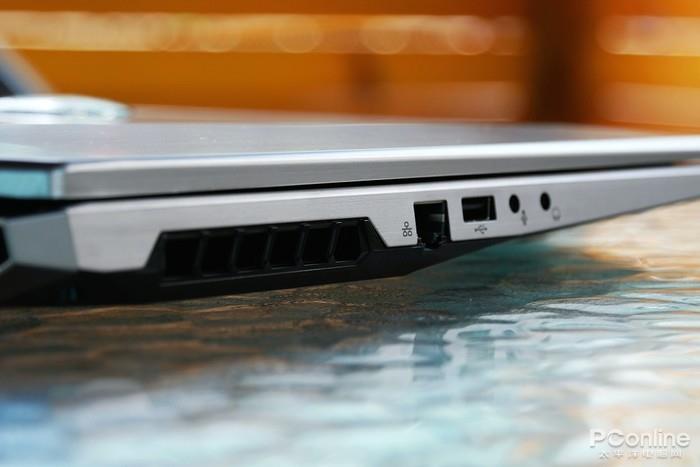 火影金钢T5还有大满贯的拓展接口。在机身的左侧,有1个USB3.0接口、1个RJ45网线接口、1个耳机接口、1个麦克风接口。