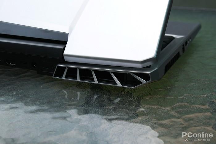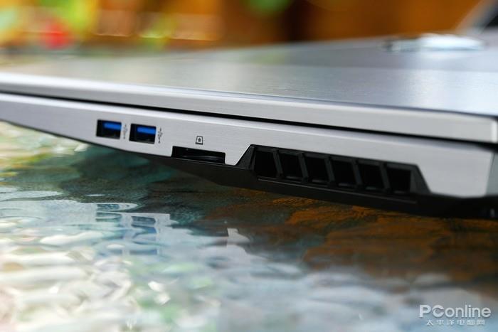 机身右侧则有2个USB3.0接口、1个SD卡槽。更多的拓展接口则隐藏在机身的后边,这里有2个DP接口、1个Type-C接口、1个HDMI接口、以及防盗锁口和电源插口。