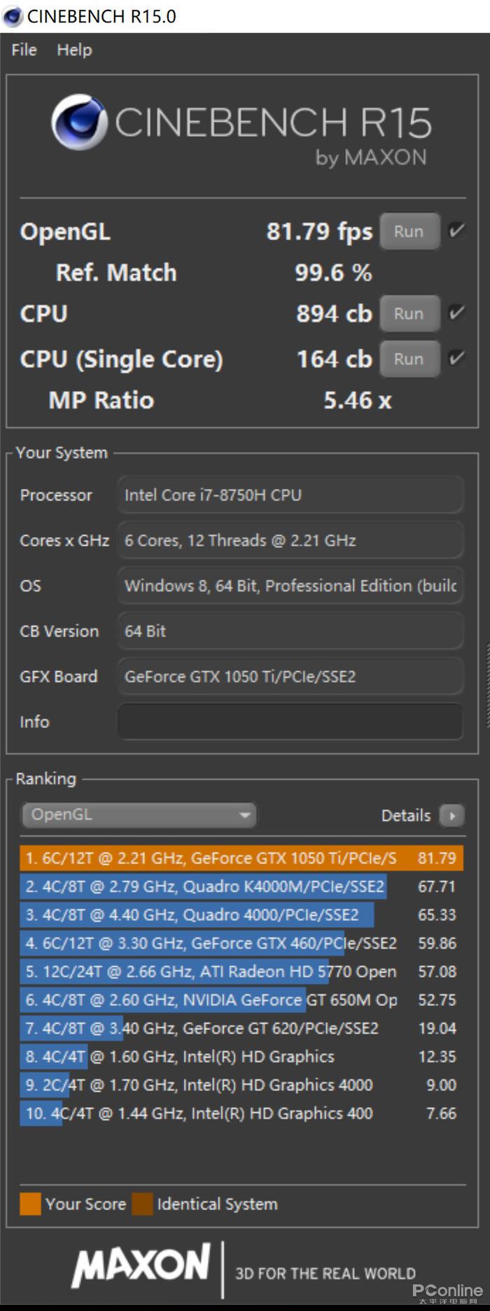 而在另一款软件Cinebench R15测试中,Intel Core i7-8750H的多核处理能力得分为894cb,单核处理能力高达164cb。相比于Intel Core i7-7700HQ的750cb的成绩的确是高出了不少。