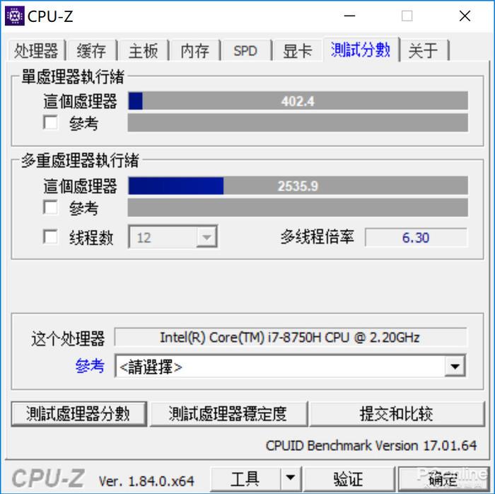 在CPU-Z这款软件的测试中,Intel Core i7-8750H的多核处理能力得分为2535.9分,单核处理能力高达402.4分。