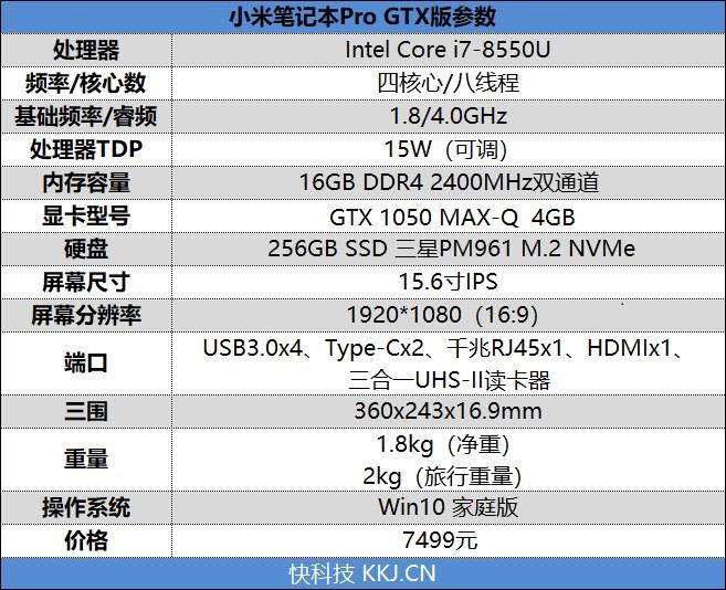 小米笔记本Pro GTX版配备第八代英特尔酷睿i7-8550U,无锁4核8线程,,四核心八线程并拥有完整的8M三级缓存,基础频率1.8GHz,单核睿频可达4.0GHz,全核频率也能达到3.8GHz。