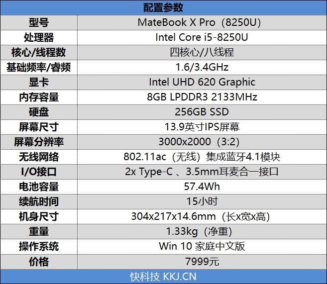 处理器方面使用了英特尔最新的酷睿i5-8250U,基于14nm++工艺制程,采用四核心八线程设计,默认主频为1.6GHz,支持睿频至3.4GHz,3级缓存6MB,TDP为15W。良好的工业设计配合低功耗的处理器,MateBook X Pro凭借一块57.4Wh的“小容量”锂电池就实现了15小时的网页浏览续航时间。