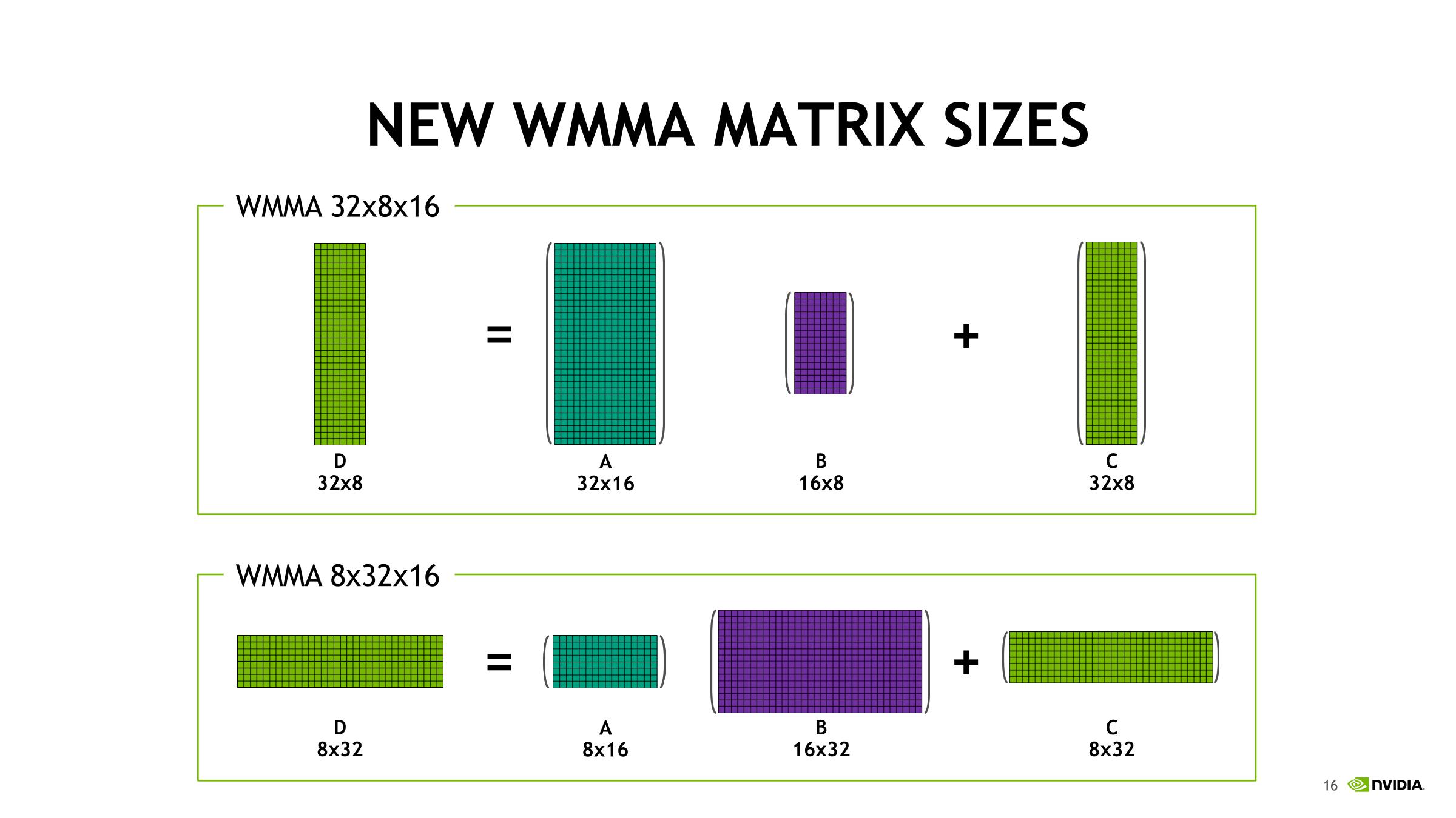 一般而言,给定A*B+C Tensor Core操作,片段由A的8个FP16*2元素(即16个FP16元素)和B的另外8个FP16*2元素,以及FP16累加器的4个FP16*2元素或 FP32累加器的8个FP32元素组成。