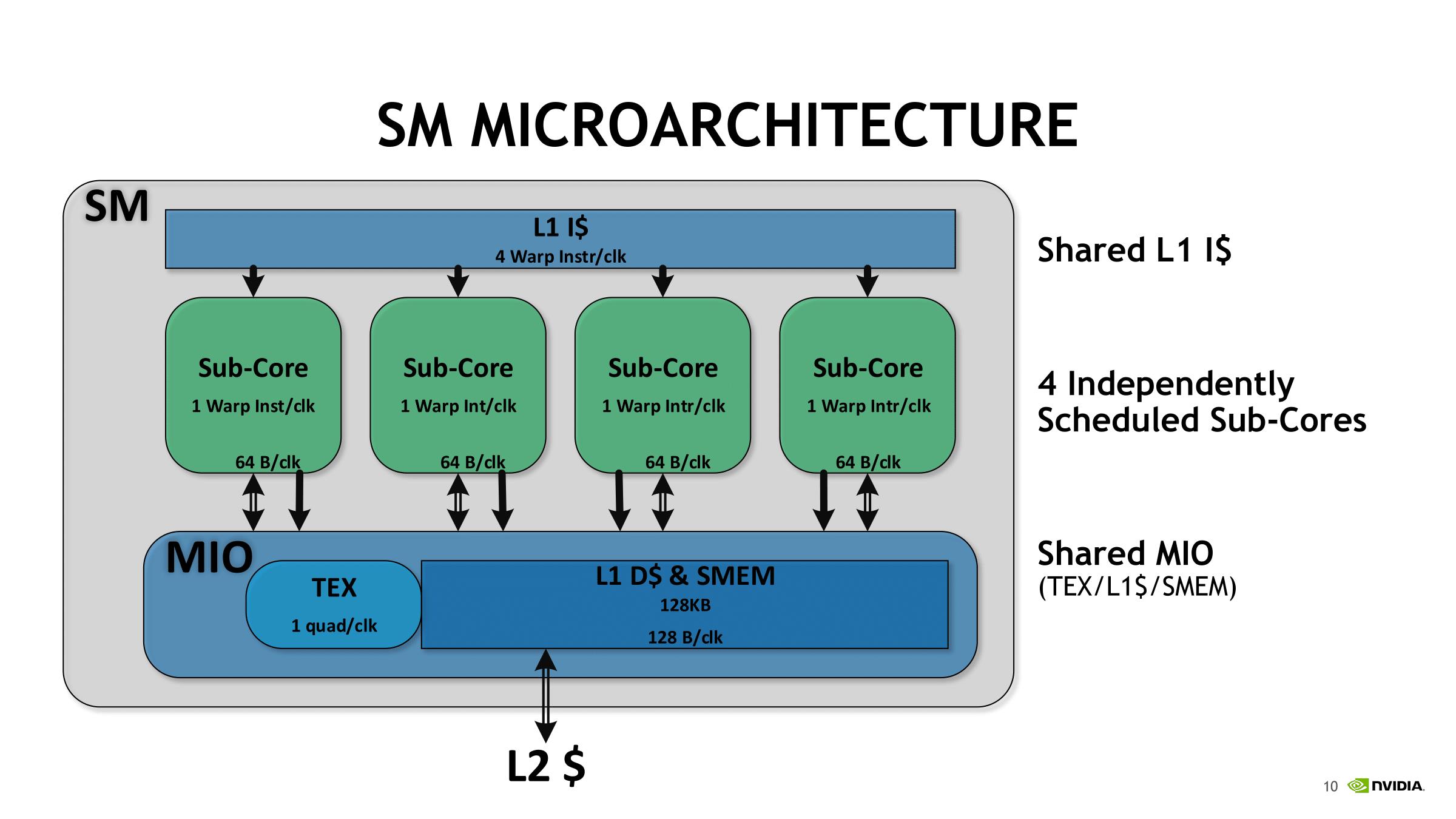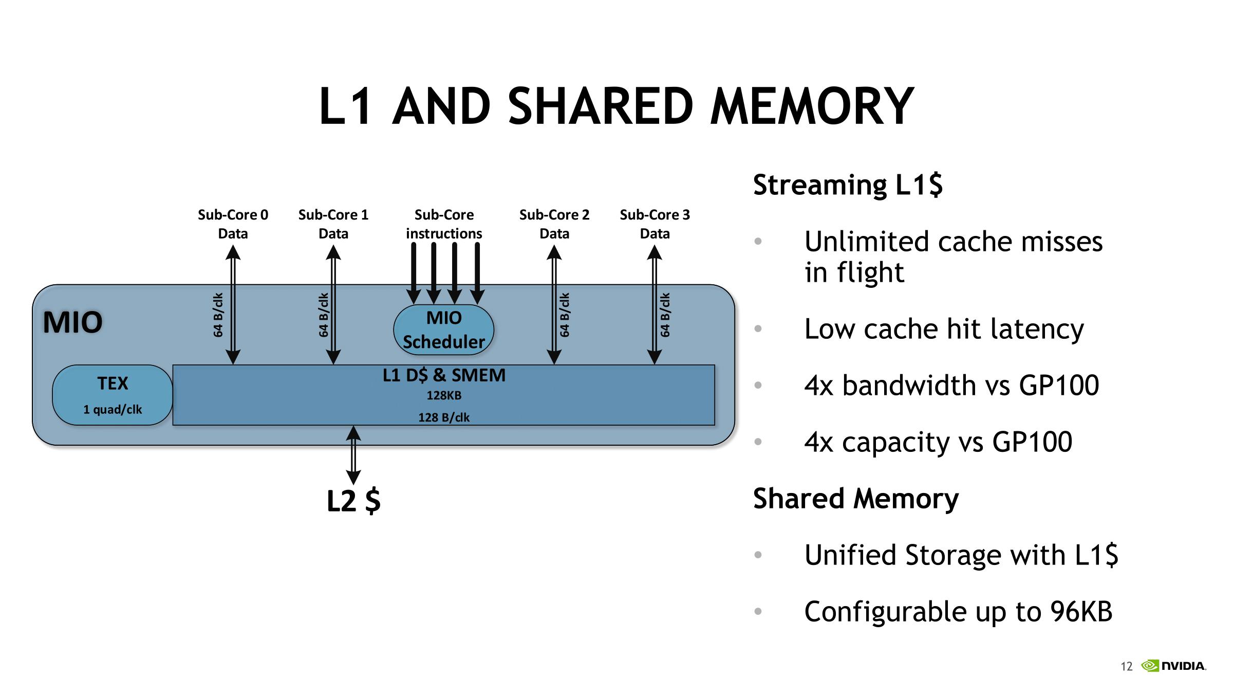 另一个重大变化是合并L1缓存和共享内存。在同一个块中,共享内存可配置为每SM 最高96 KB。HBM2控制器也进行了更新,其效率提高了10~15%。