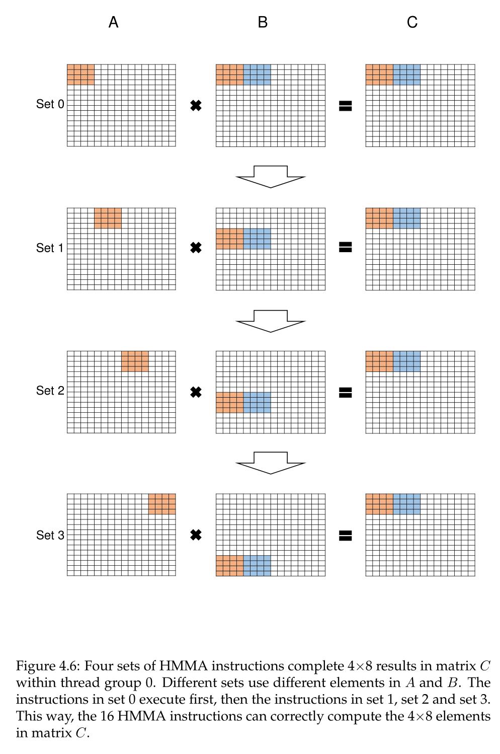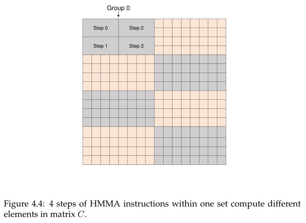 在一个集合中,可以并行完成四个HMMA步骤,每个步骤适用于4*2子块。这四个线程直接链接到寄存器中的那些矩阵值,因此线程组可以处理单个Step 0 HMMA指令,从而一次性计算子块。