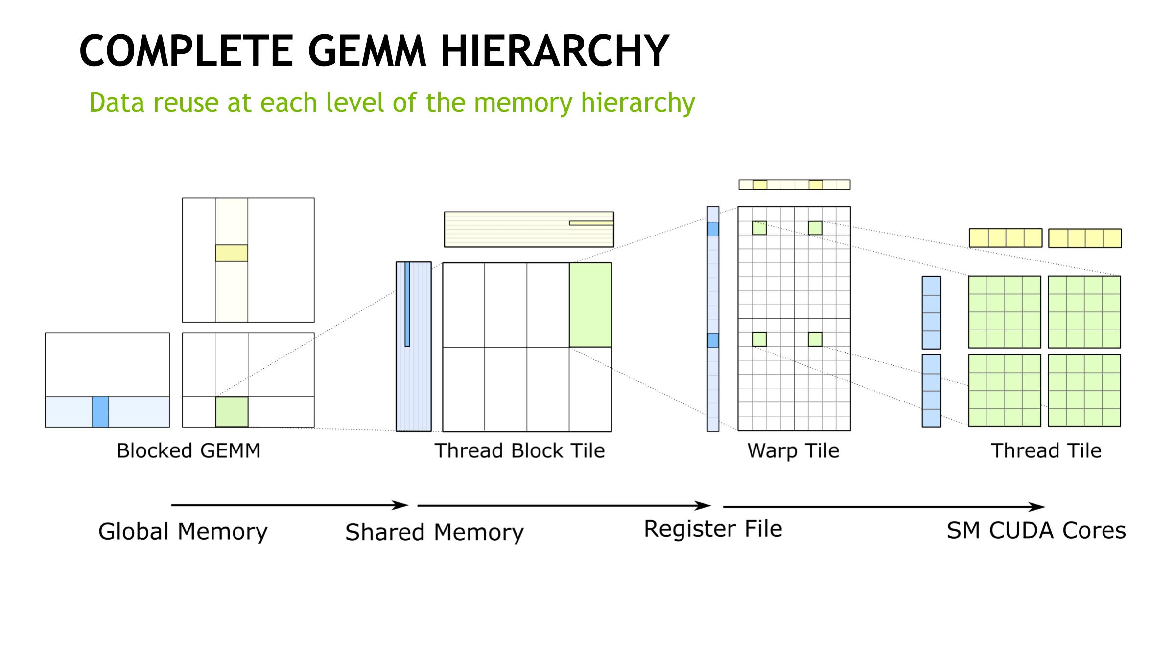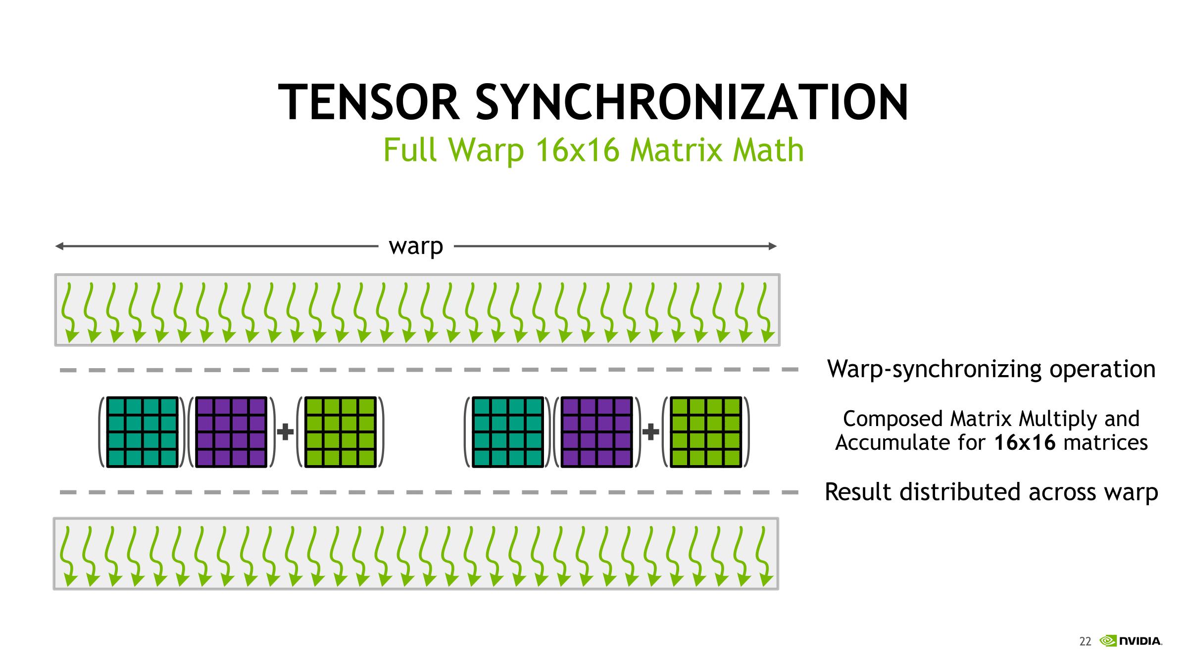在Tensor Core执行实际指令时,即使在使用NVVM IR(LLVM)的编译器级别上,也仅存在用于warp级矩阵操作的本征,对于CUDA++和PTX ISA,warp级别仍然是唯一级别。加载输入矩阵的形式是每个扭曲线程持有一个片段,其分布和身份均未指定。从广义上讲,它遵循标准CUDA核心的基于线程级别拼接的GEMM计算的相同模式。