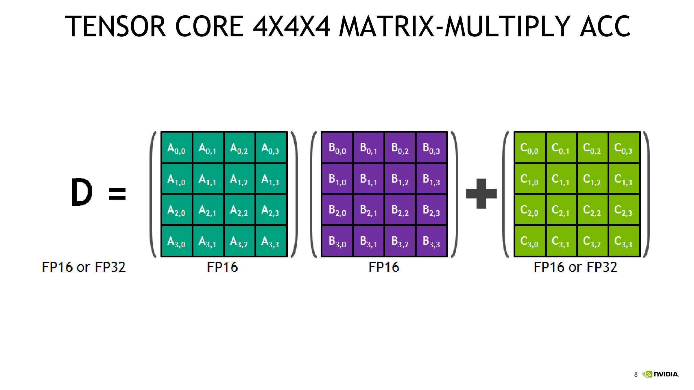 NVIDIA将Tensor Core进行的这种运算称为混合精度数学,因为输入矩阵的精度为半精度,但乘积可以达到完全精度。碰巧的是,Tensor Core所做的这种运算在深度学习训练和推理中很常见。