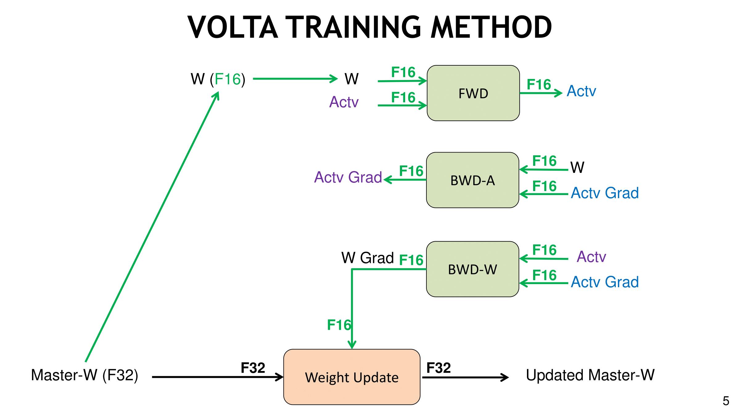 Volta的深度学习能力是建立在利用半精度浮点(IEEE-754 FP16)而非单精度浮点(FP32)进行深度学习训练的基础之上。