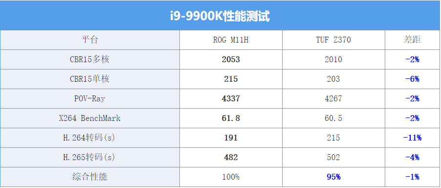 综合了6项测试,i9-9900K在华硕ROG M11H(WI-FI)上会强5%左右,这个差距不算特别大,但也是一个不可忽视的差距了。