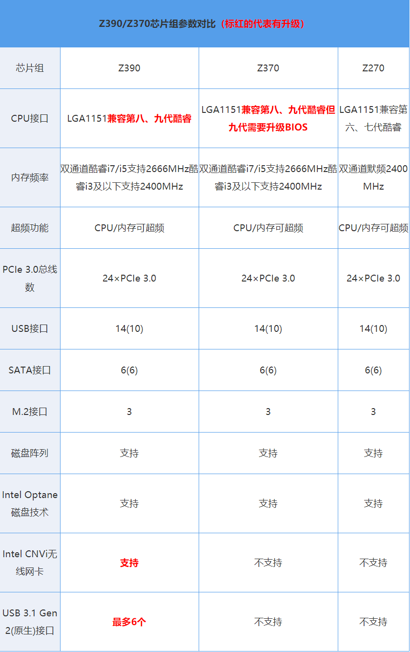 而华硕TUF Z370-PRO GAMING则是上一代的中低端主板了,隶属于主打性价比的电竞产品线TUF特种部队,现在电商平台定价约为1700元,但是基于Z370芯片组的它还是能支持超频,也有有非常丰富的拓展通道。具体关于Z370芯片组和Z390芯片组的异同可以看下图。