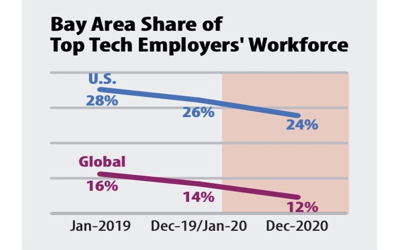 技术岗位从硅谷外流,正在从个体公司的转变逐渐发展成一种的趋势。据圣何塞的智库 Joint Venture Silicon Valley 日前发布的研究报告:2018 年,硅谷15家规模最大的科技公司位于旧金山湾区的劳动力占全美的28%,但这一比例在 2019 年降至 26%,到 2020 年降至 24%。而在全球层面,这些科技公司在 2018 年位于湾区的劳动力占全球的16%,2020 年则已经降至为 12%。