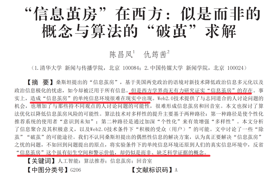 清华大学和中国传媒大学两位学者曾发表一篇文章,提到「 信息茧房 」是个似是而非的概念,没有有力的研究能证实它的存在,造成「 信息茧房 」的环境很难出现。