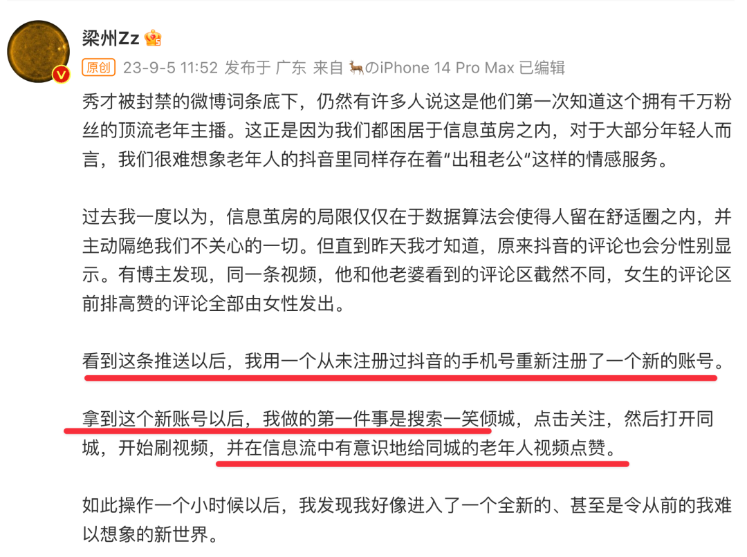 他们往往处在低频、单线程的社交环境中,他们认识互联网世界的方式,除了微信可能只有某个短视频平台。对于他们来说,长期只获取自己「 应该 」获取的信息,真的没问题吗?