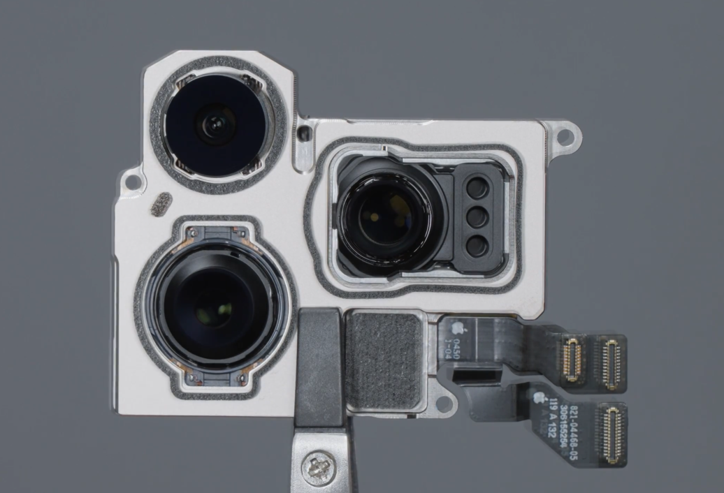 第一种是将三颗摄像头先集成在同一个金属防滚架上,再把整个金属框架固定在手机里面。