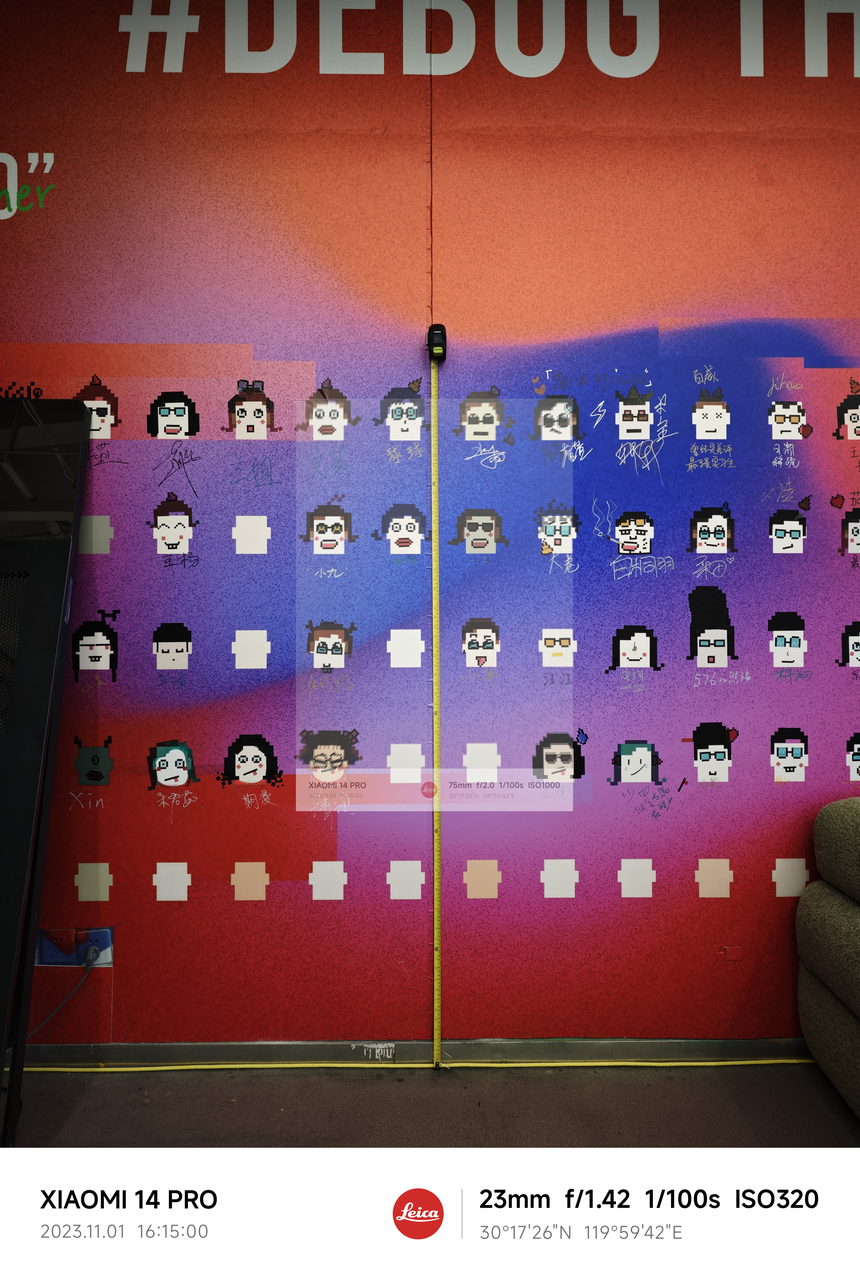 整个测试过程大概是这样:测试中手机固定在距离墙面大约三米的三脚架上,使用每一个摄像头拍一张照。