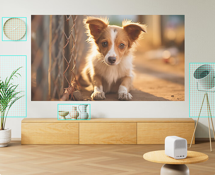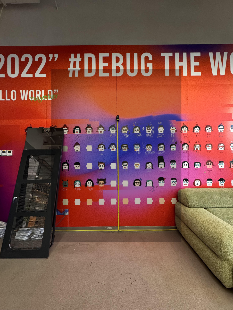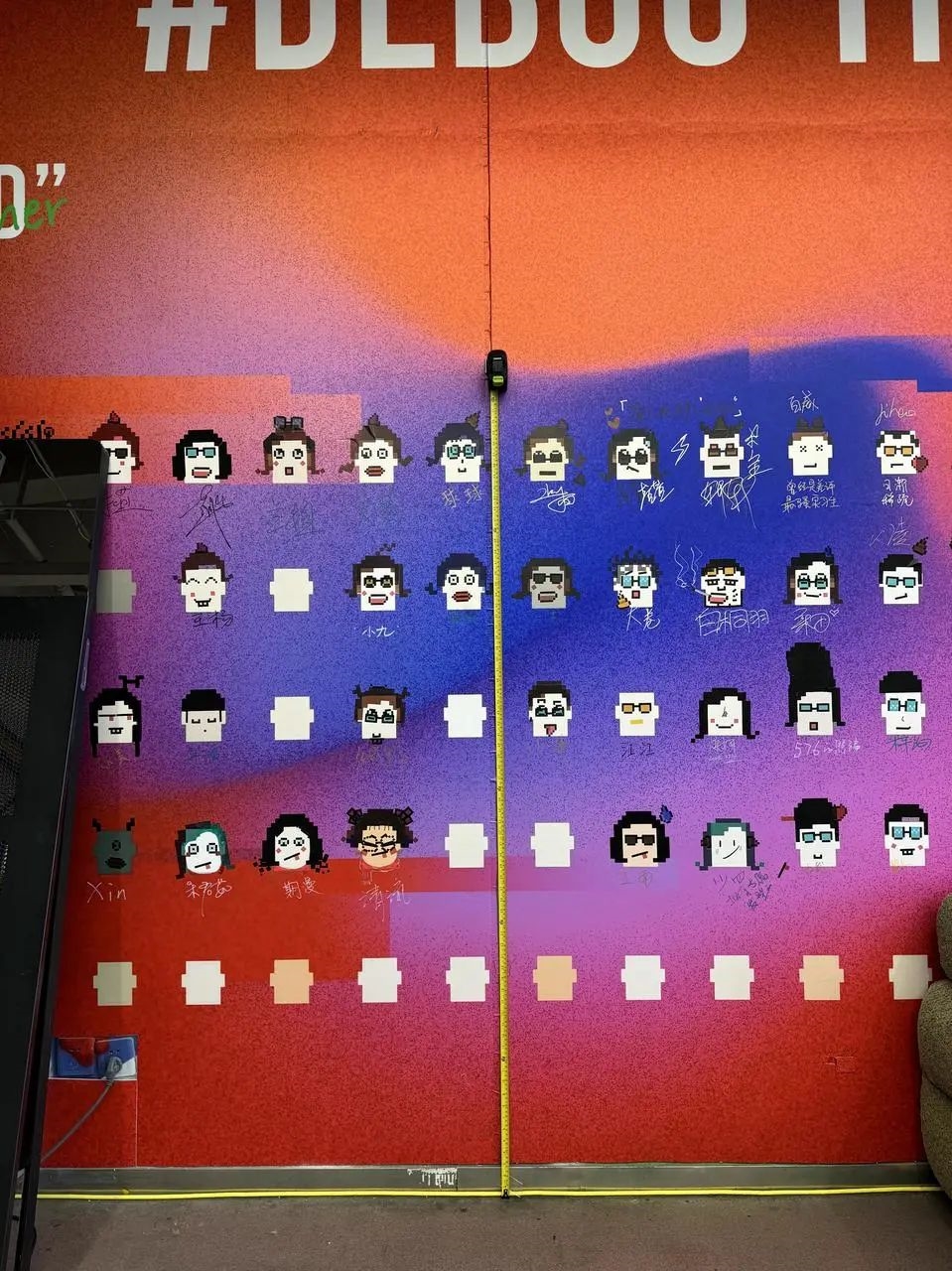 为了简单看出摄像头之间有没有对齐,我们在办公室的海报墙上贴上了一个笔直的卷尺,刚好和地上的一根黄色网线垂直。