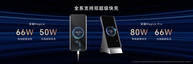 聊完了影像,我们再来聊聊续航。荣耀手机的续航体验可以说是有口皆碑,本次荣耀Magic6 Pro的续航体验得到了再次升级,采用了5600mAh超大容量电池+80W有线快充+66W无线快充的硬件组合。