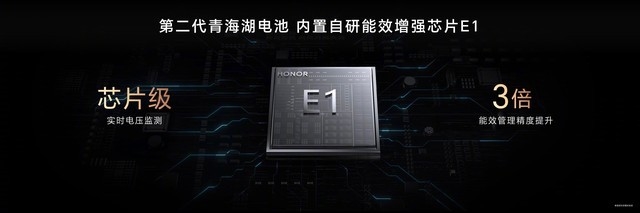 为了实现这套方案,荣耀还定制了一颗自研芯片:HONOR E1,该芯片集成电量计IC、保护IC和防伪IC为一体,从硬件层面为手机能效提升提供支持。