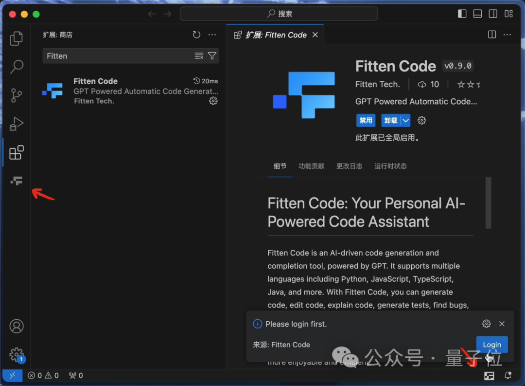 以Visual Studio Code为例,在扩展页面中搜索“Fitten Code”:
