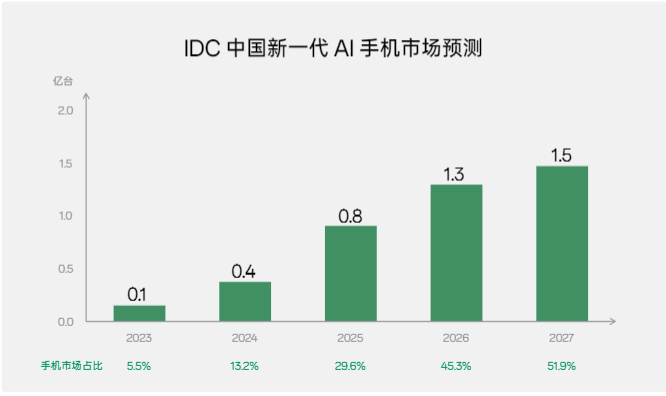 IDC预测2027年AI手机销量或将达到1.5亿台,占中国手机市场份额超过50%。搭载AI功能的三星GalaxyS24系列在韩国开售仅28天销量突破百万部,刷新S系列手机销量最快破百万纪录。