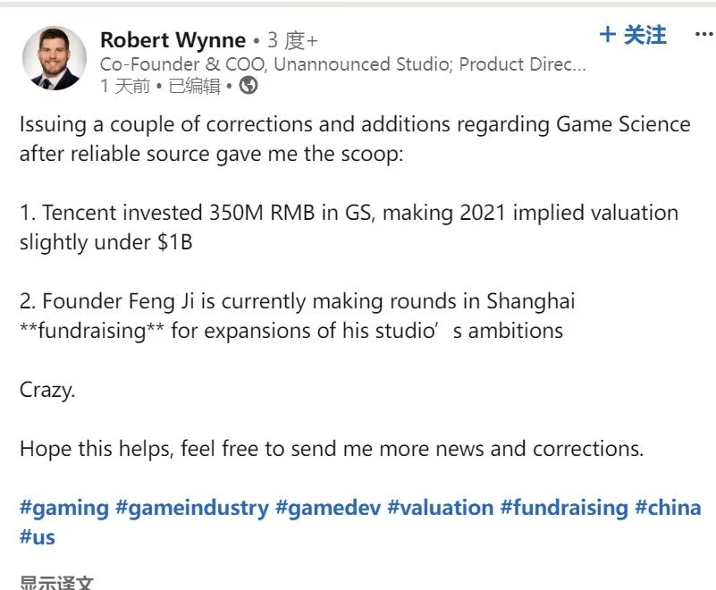 而在事实上,腾讯在《黑神话》开发过程中发挥的作用,甚至比英雄更大一些。根据前动视上海高级经理Robert Wynne在领英上的爆料,“腾讯向游科投资了3.5亿人民币。让游科在21年的隐含估值略低于10亿美元。目前冯骥正在上海四处拉投资,筹措资金以扩大工作室规模。”