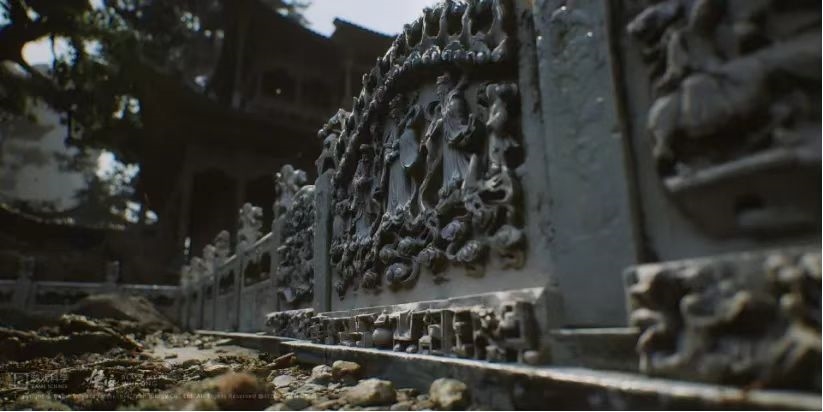 换引擎只是其中一环。更大的技术难点在于,《黑神话》可能是第一个同时应用虚幻5 nanite特性(上亿多边形物体实时渲染)和 lumen特性(一种完全动态的GI解决方案,可对场景和光线变化立即做出反应)的业界3A作品。这个技术的特点在于,扫描建模之后,不需太多手动修改即可投入使用。(玩家看到的“到此一游”和“钢筋”,本质上是技术“过于先进”的结果)