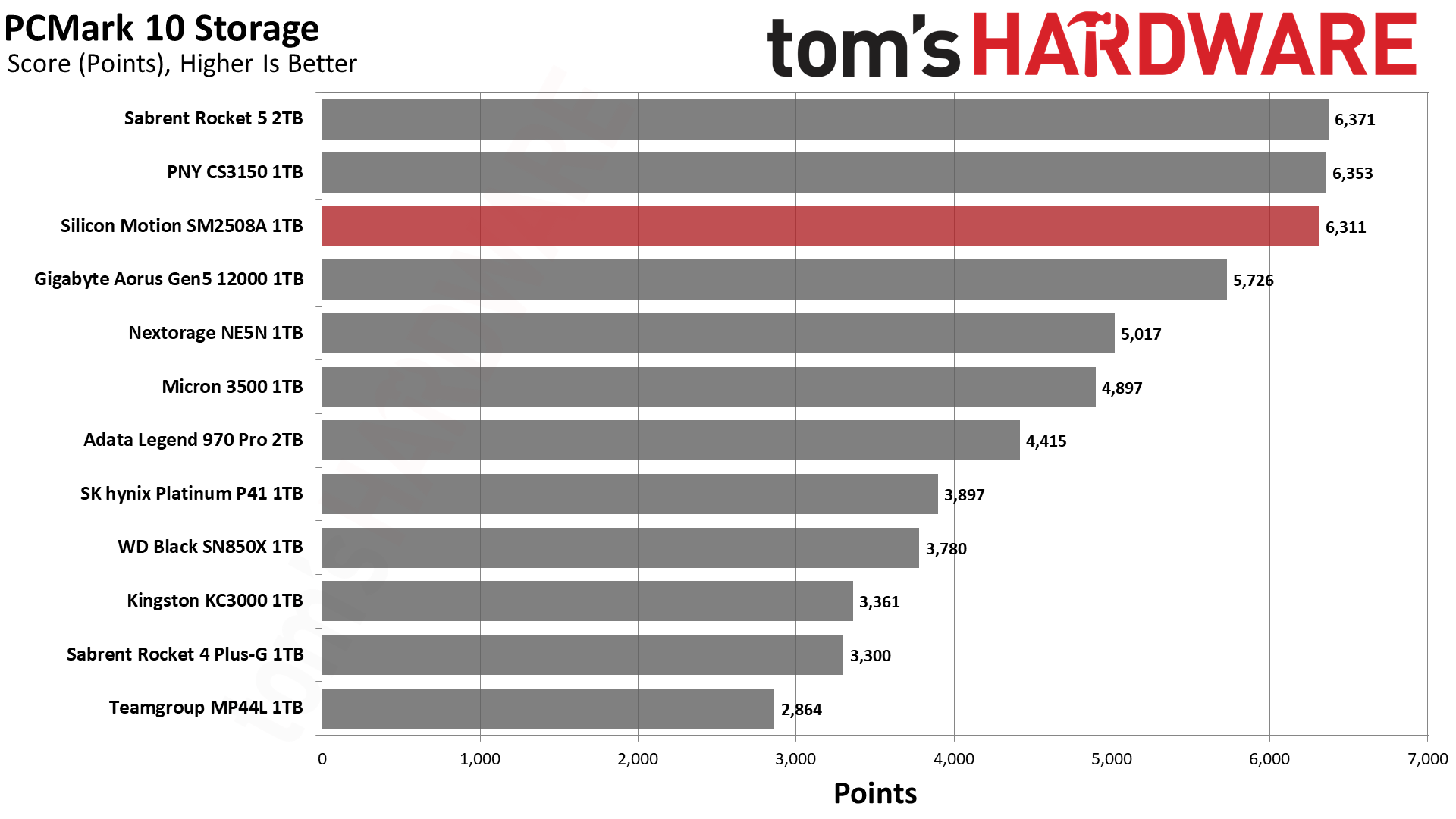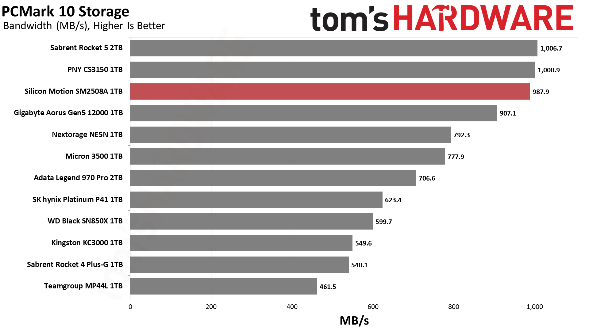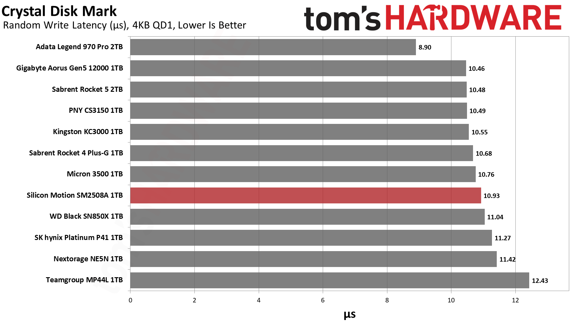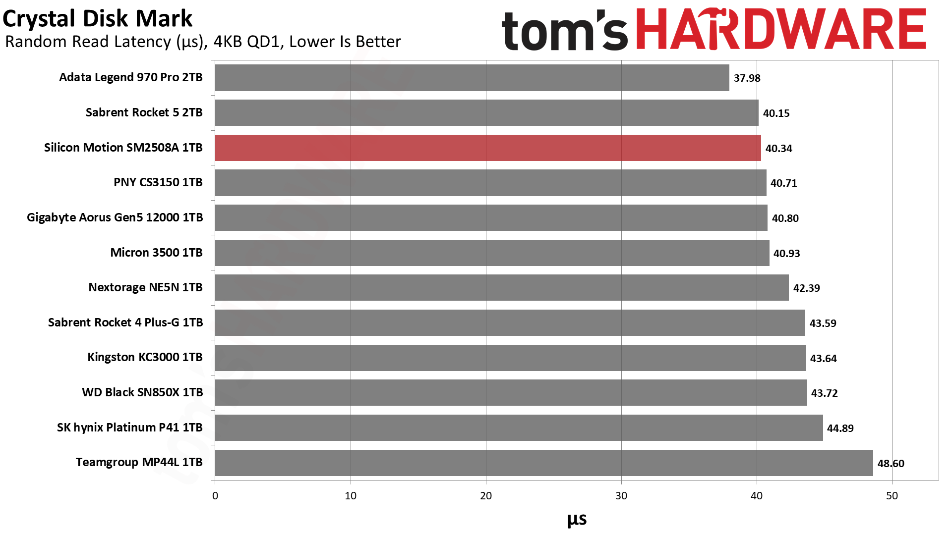 毫无意外,SM2508延迟最低,带宽最高,得分最佳,不过和PNY、Sabrent的差距微乎其微。