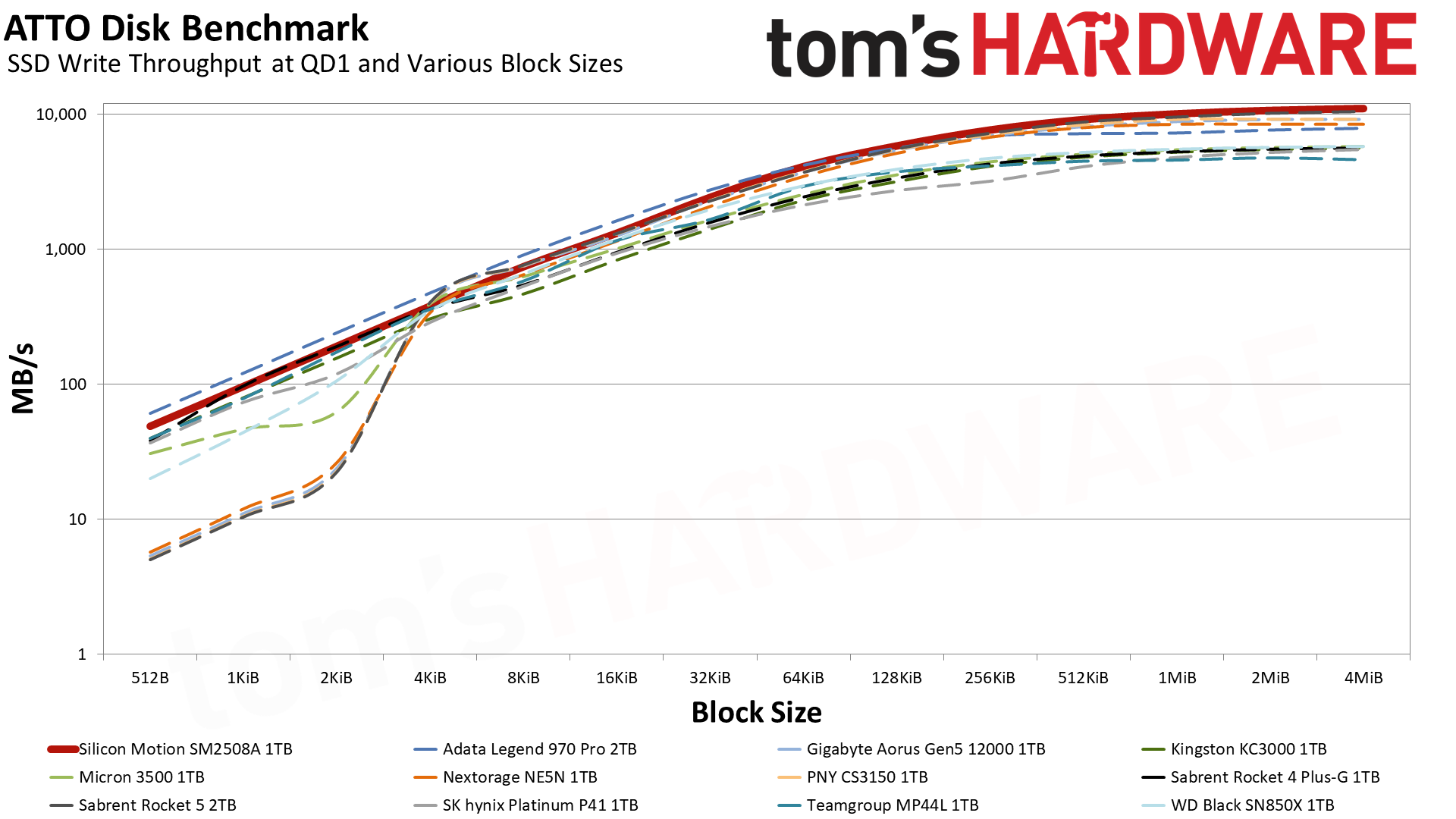 SM2508的表现几乎无可挑剔,始终都是最好的,而且不同区块的性能变化非常顺滑,一直在稳步提升,不像其他方案在大区块下性能提升有限,甚至还在倒退,尤其是E26 SSD。