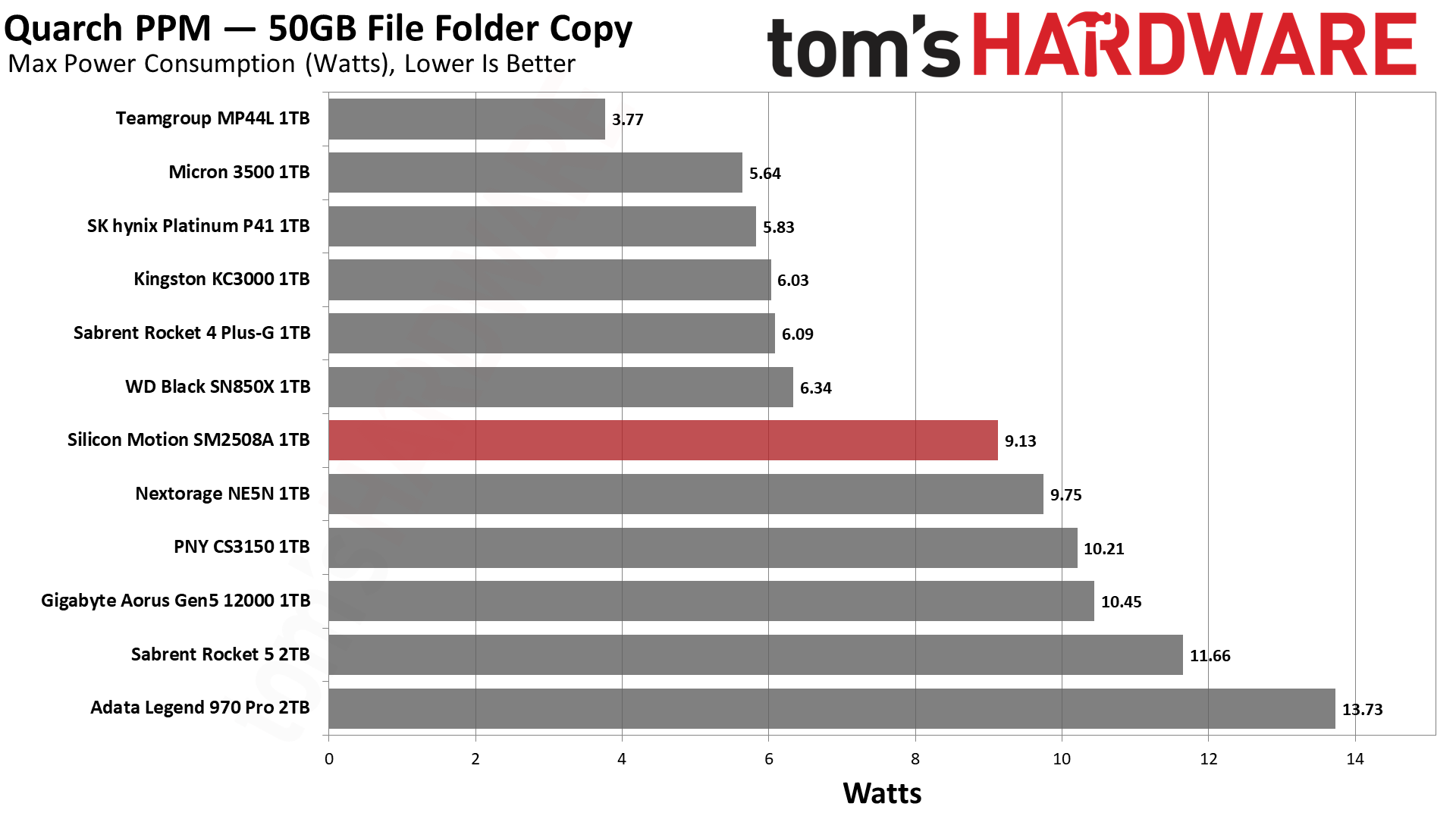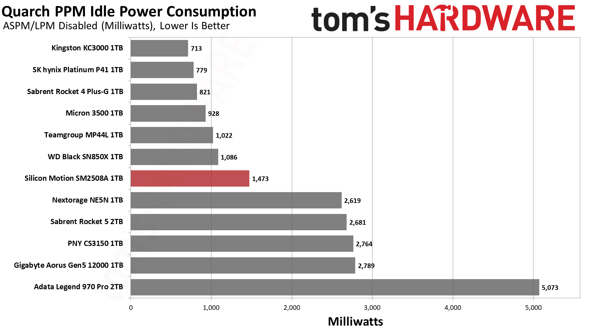待机状态下只有不到1.5W,虽然明显高于PCIe 4.0 SSD,但是比其他PCIe 5.0 SSD低太多了,群联方案的普遍在2.7W上下,英韧方案的居然超过5W。