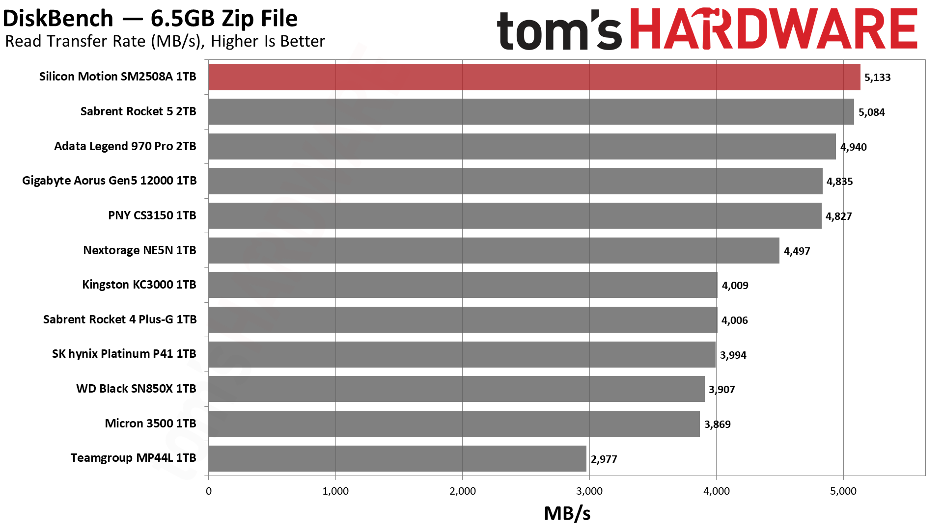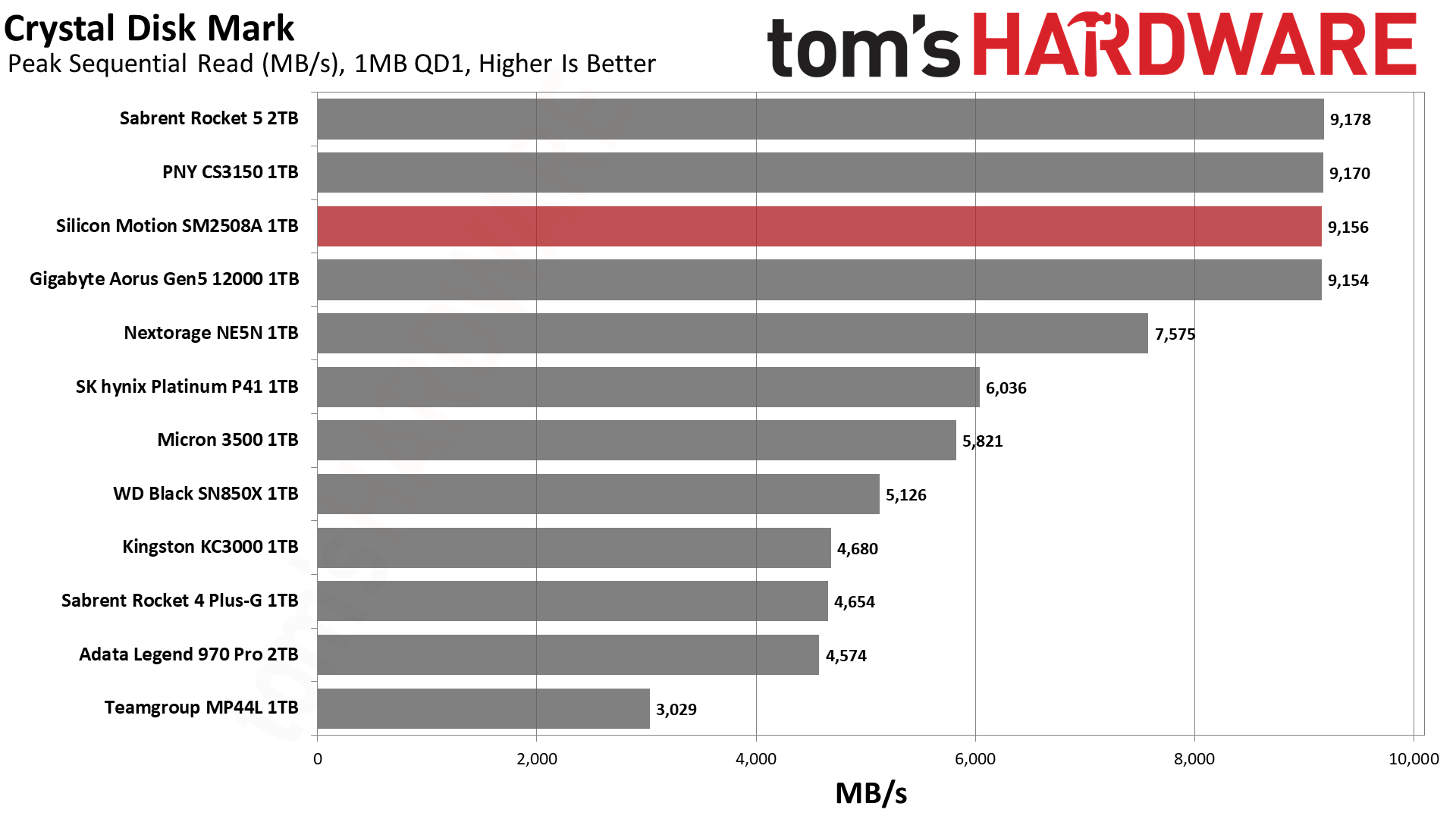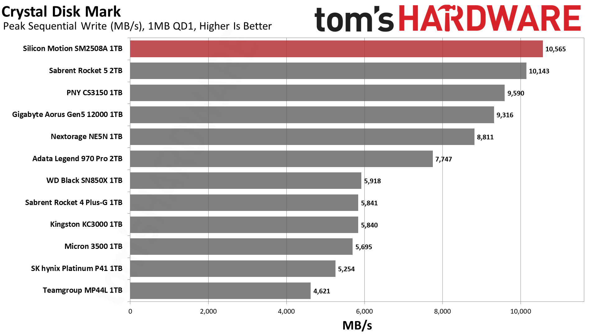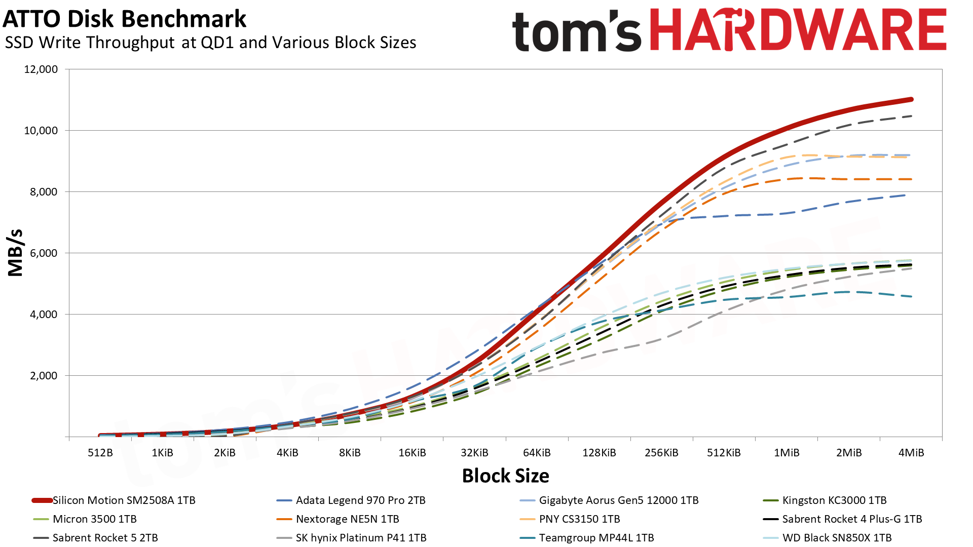 参与对比的PCIe 5.0 SSD很多,群联方案的技嘉Aorus Gen5 12000 1TB、Sabrent Rocket 5 2TB、PNY CS3150、Nextorage NE5N,英韧方案的有威刚Legend 970 Pro 2TB。