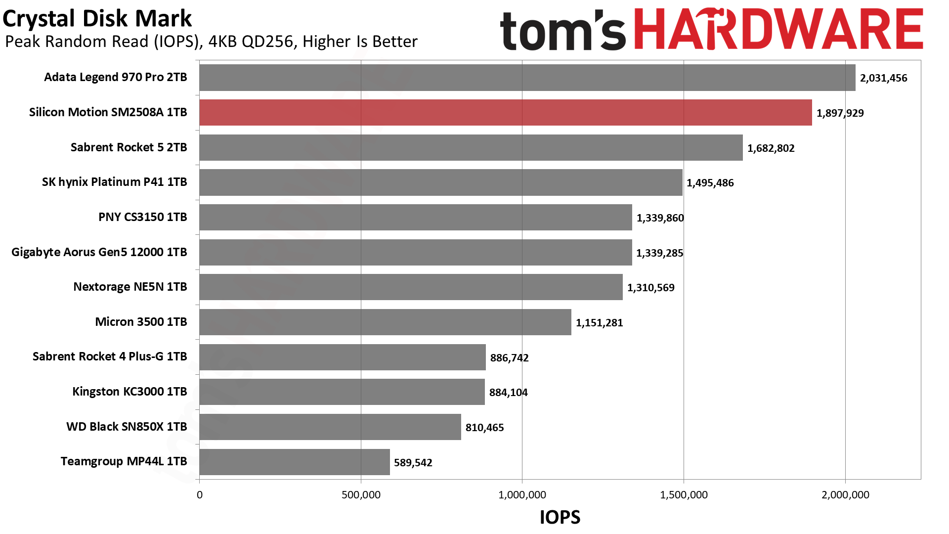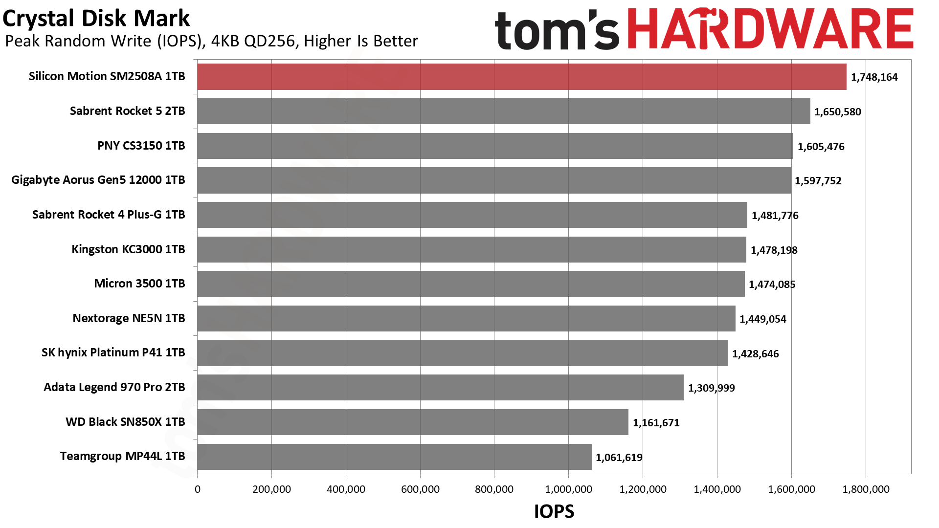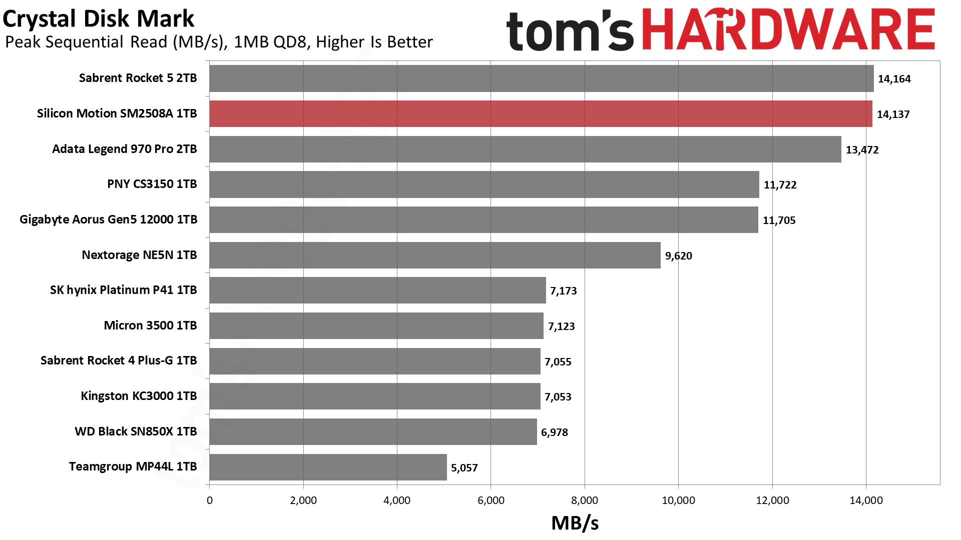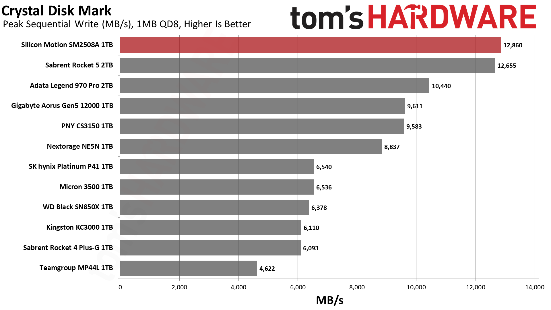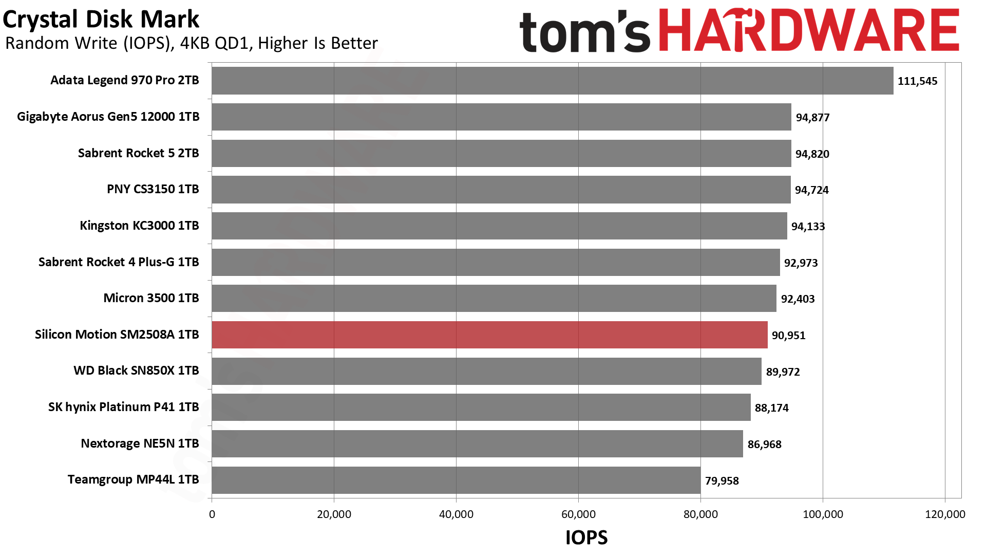 大家最熟悉的测试,SM2508的顺序读取可以跑满14GB/s,顺序写入则逼近13GB/s,随机读写也稳居前列。