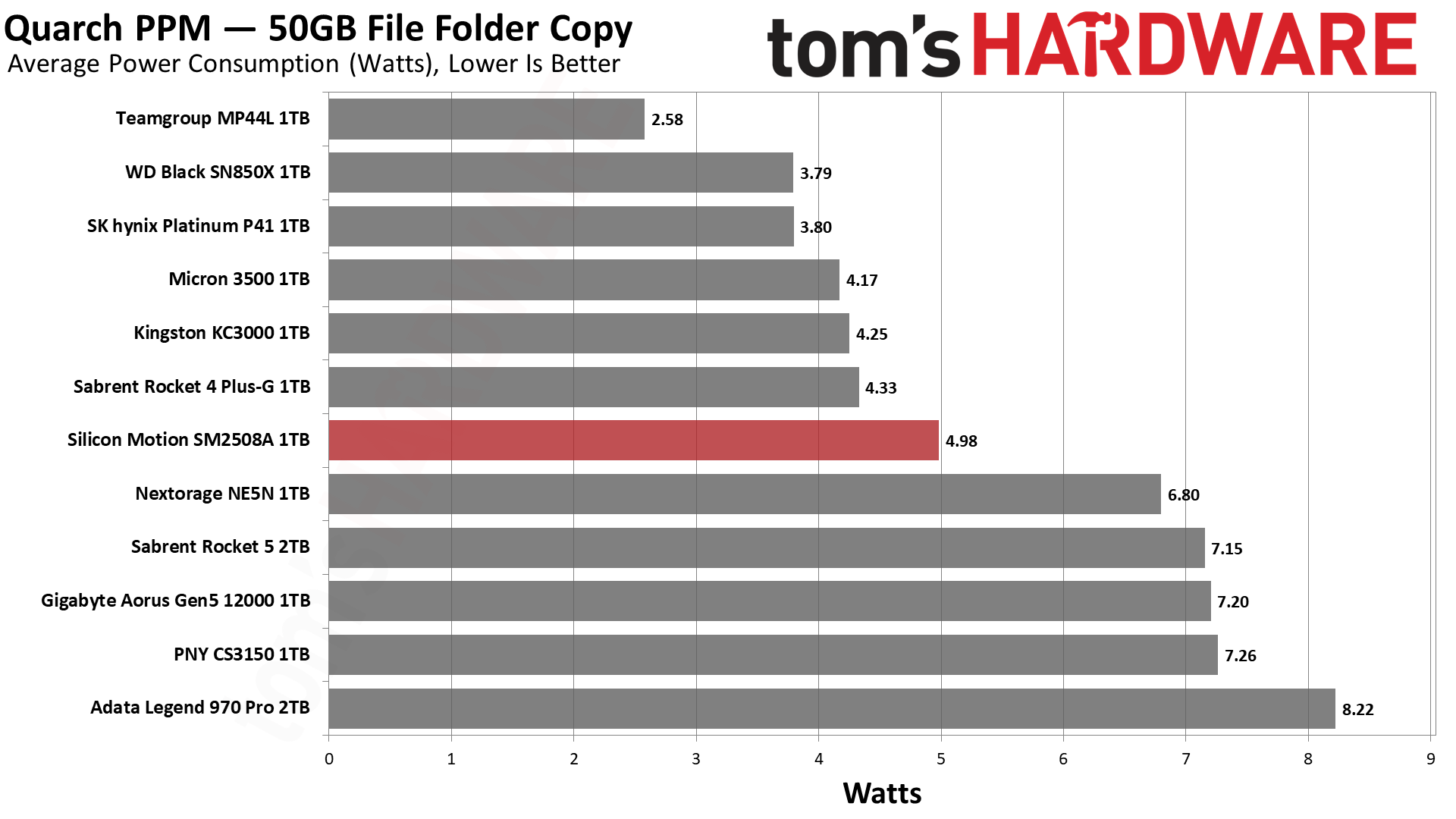 拷贝场景平均功耗5W,略高于PCIe 4.0 SSD,而群联方案普遍超过7W,英韧的超过8W。