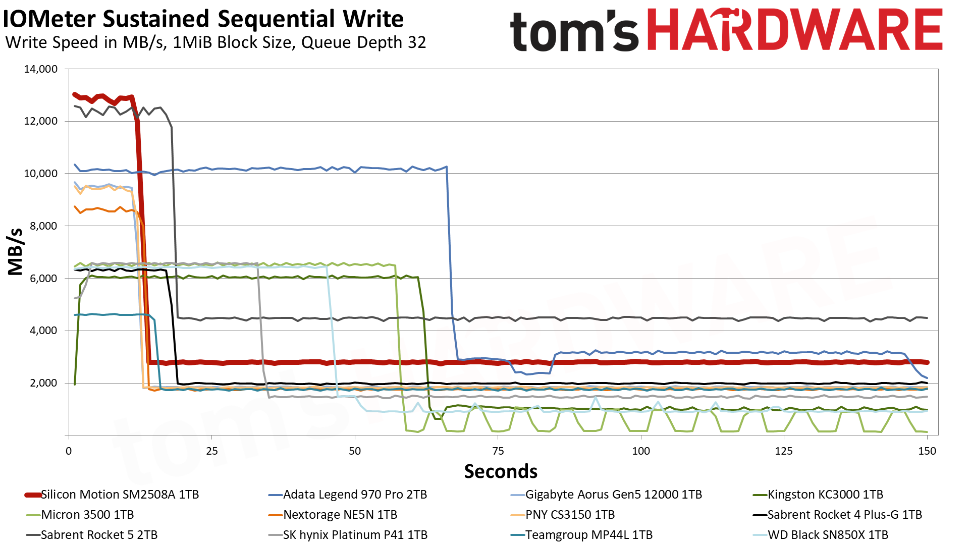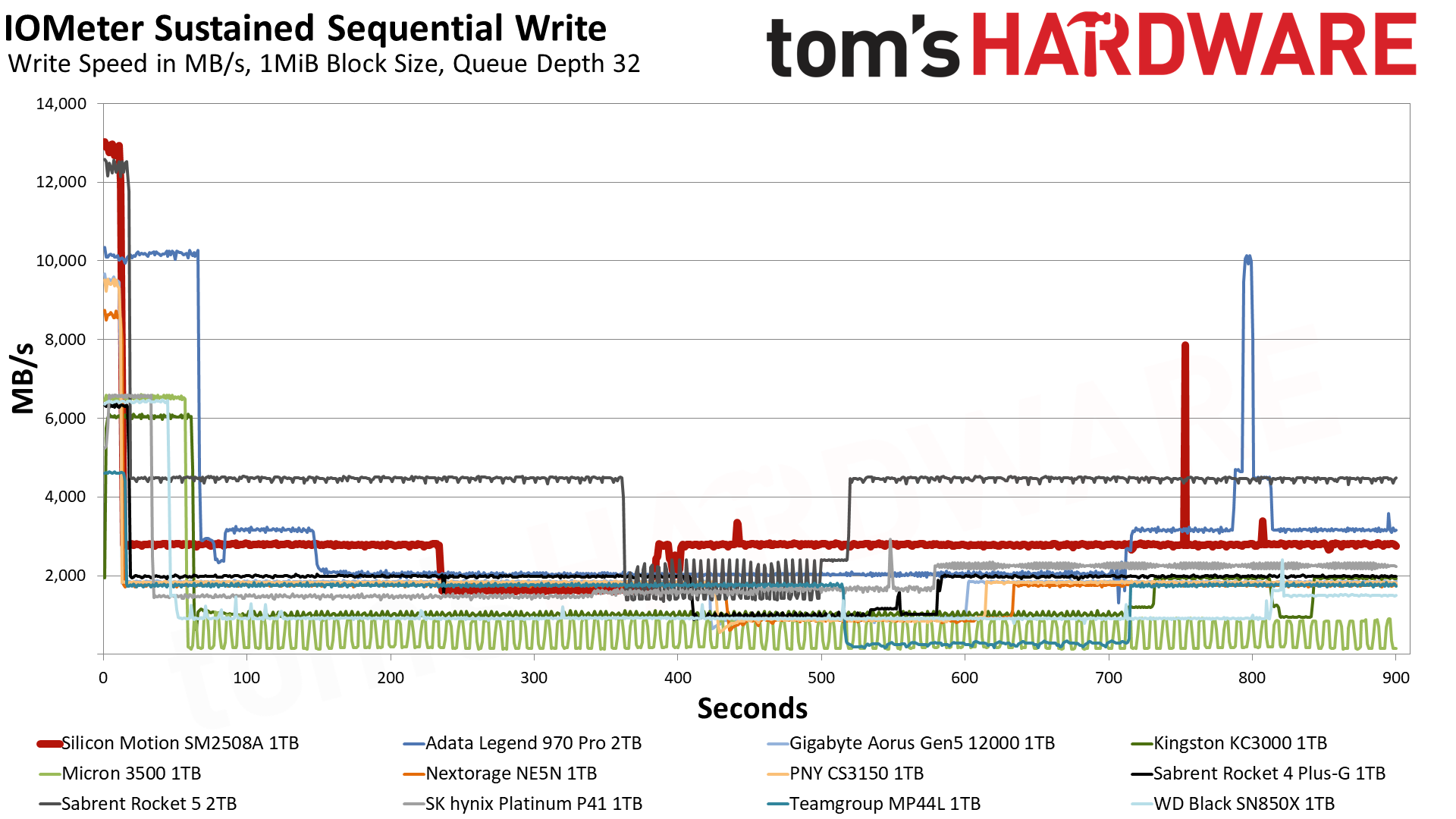 SM2508样品的缓存容量只有大约160GB,期间可以稳定跑到12.9GB/s,但也持续了12.5秒钟,之后就回归TLC模式,稳定在2.8GB/s,一直到测试结束。