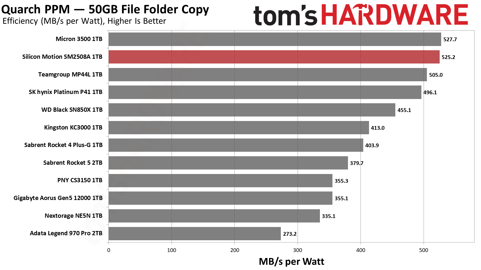 能效是绝对顶级水准,甚至超过很多PCIe 4.0 SSD,其他的PCIe 5.0 SSD就没法看了,群联方案落后其至少30%,英韧的更是差了足足一半。
