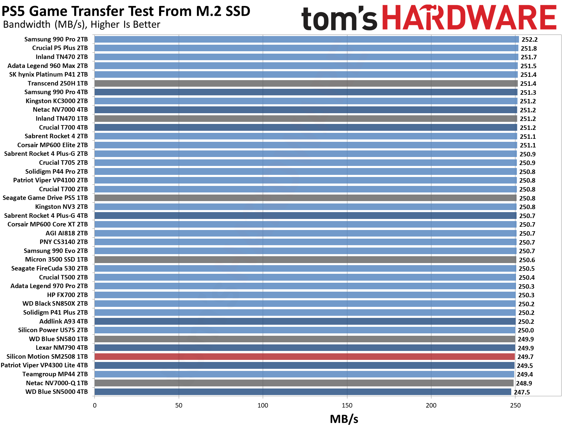 在PS5和外部M.2 SSD之间来回读写数据,SM2508的表现“泯然众人”,和PCIe 4.0 SSD基本没啥两样,显然对于这样空间受限的应用,PCIe 5.0 SSD还是会遇到明显的发热限制,很难释放出全部潜力。