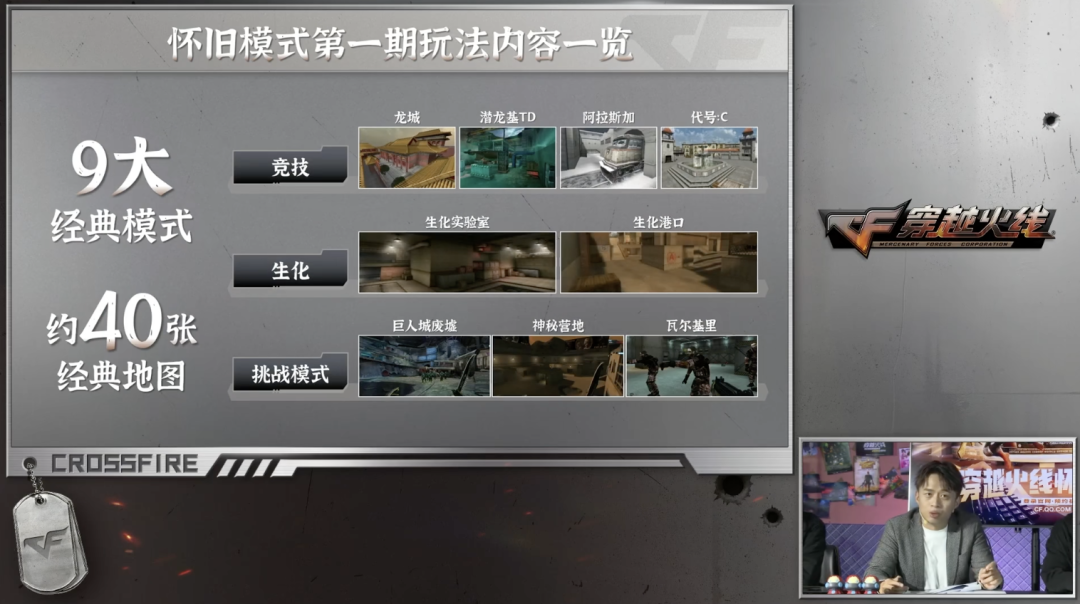 根据披露的内容,第一期的怀旧模式上线了 9 大经典模式和 40 张经典地图,其中有些地图是之前下架过的,现在又捞出来了。