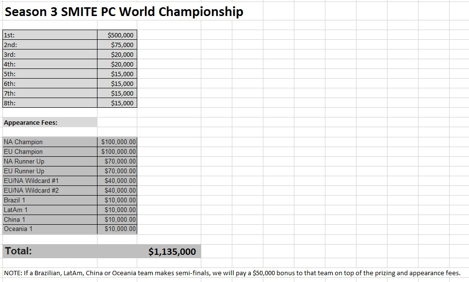 在第一届全球锦标赛后, Hi-Rez Studios 决定把全球锦标赛的奖金设置一个 100 万美元的天花板,把超出的资金分配到其他赛事中。