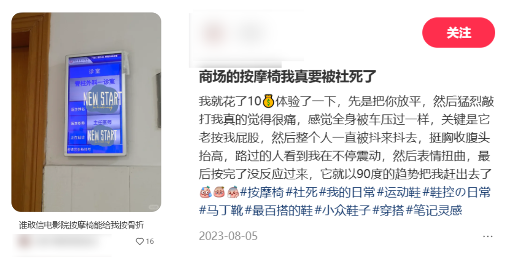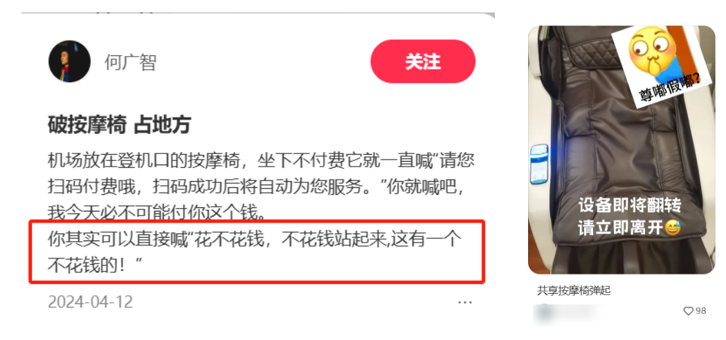 如果你在社交平台上搜索共享按摩椅,基本清一色都是吐槽贴。