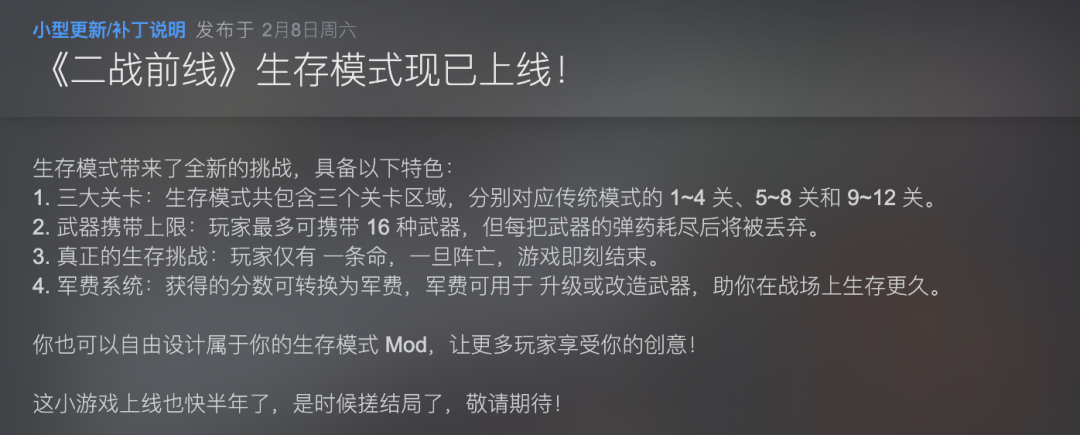 这波更新有两个重点,一是给游戏上线了生存模式,让玩家有新鲜东西可以玩。