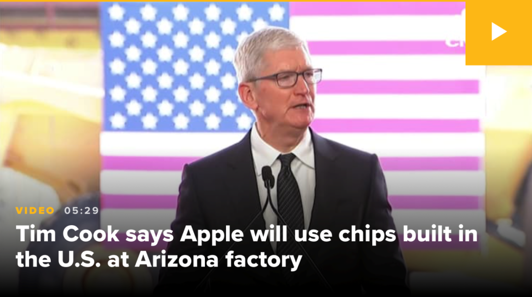 2022年,拜登政府推出了“芯片法案”,通过高额补贴鼓励芯片巨头在美国投资建厂。库克又是科技巨头中第一个表态支持,计划使用台积电在亚利桑那工厂制造的芯片。那年12月,拜登在亚利桑那州主持了发布会,库克和其他芯片巨头一道参加了活动。
