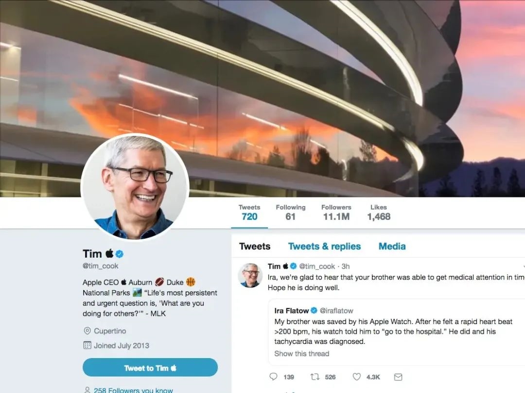 一个有趣的花絮是,2019年3月的白宫会议上,特朗普一时口误,把Tim Cook称为Tim Apple,成为了社交媒体上的笑谈。而库克似乎并不觉得尴尬,反而将自己的推特用户名改成了Tim+苹果的logo。