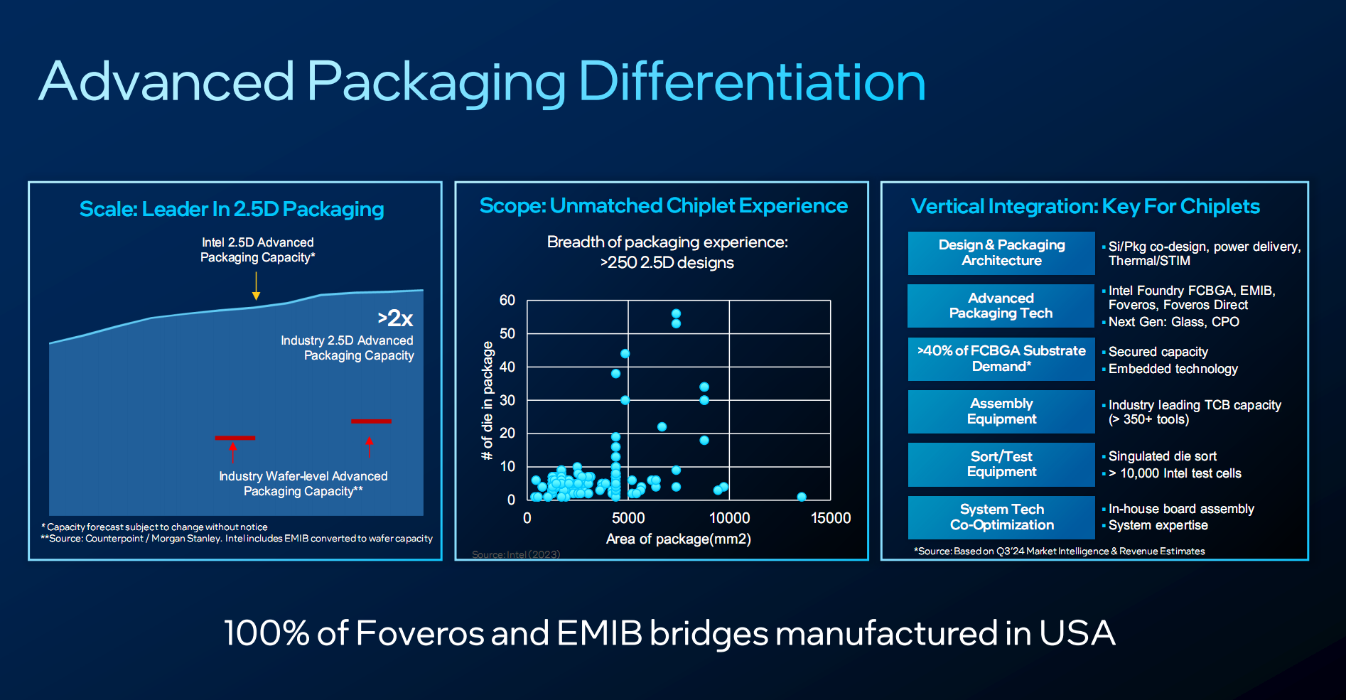 第三方数据显示,Intel EMIB 2.5D、Foveros 2.5D封装的总产能,对比行业晶圆级先进封装的总产能,规模领先2倍以上。